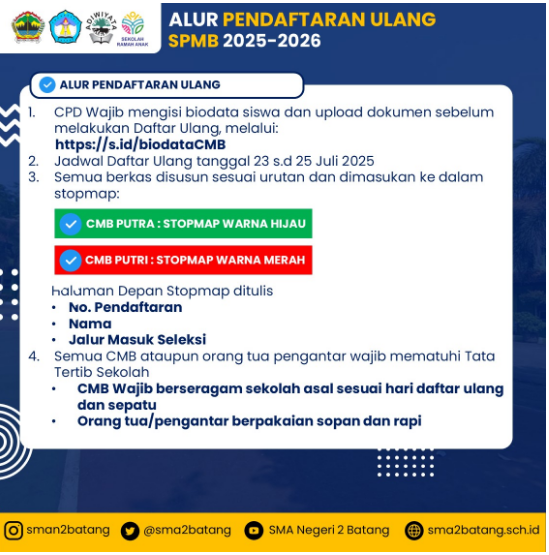 Pendaftaran ulang (daftar ulang) calon murid baru (CMB) SMA Negeri 2 Batang tahun ajaran 2025/2026 akan segera dilaksanakan. Calon murid yang dinyatakan diterima perlu melakukan daftar ulang dengan membawa persyaratan yang telah ditentukan. Informasi lebih lanjut mengenai jadwal dan persyaratan daftar ulang dapat dilihat di situs web atau media sosial SMA Negeri 2 Batang, serta situs resmi SPMB Jateng.