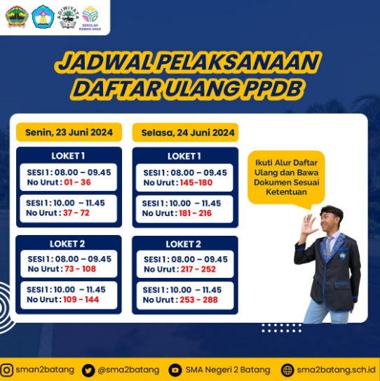Jadwal Daftar ulang 23 - 25 Juni 2025. Informasi jadwal daftar ulang diumumkan melalui situs web atau media sosial SMA Negeri 2 Batang. Calon murid diharapkan memantau informasi tersebut secara berkala.
